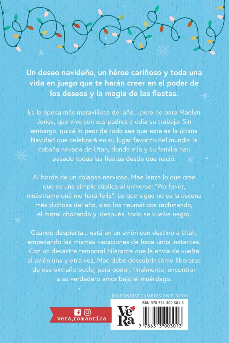 Un deseo navideño, un héroe cariñoso y toda una vida en juego que te harán creer en el poder de los deseos y la magia de las fiestas. Es la época más maravillosa del año... pero no para Maelyn Jones, que vive con sus padres y odia su trabajo. Sin embargo, quizá lo peor de todo sea que esta es la última Navidad que celebrará en su lugar favorito del mundo: la cabaña nevada de Utah, donde ella y su familia han pasado todas las fiestas desde que nació. Al borde de un colapso nervioso, Mae lanza lo que cree que es una simple súplica al universo: “Por favor, muéstrame qué me hará feliz”. Lo que sigue no es la escena más dichosa del año, sino los neumáticos rechinando, el metal chocando y, después, todo se vuelve negro. Cuando despierta... está en un avión con destino a Utah, empezando las mismas vacaciones de hace unos instantes. Con un desastre temporal hilarante que la envía de vuelta al avión una y otra vez, Mae debe descubrir cómo liberarse de ese extraño bucle, para poder, finalmente, encontrar a su verdadero amor bajo el muérdago.